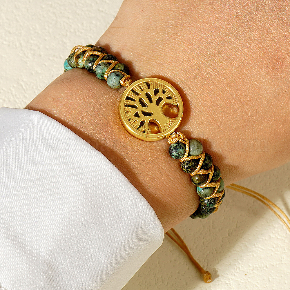 Регулируемые браслеты из круглых бусин из натуральной африканской бирюзы (яшмы), двухслойные., 304 Браслеты из нержавеющей стали для женщин и мужчин, древо жизни