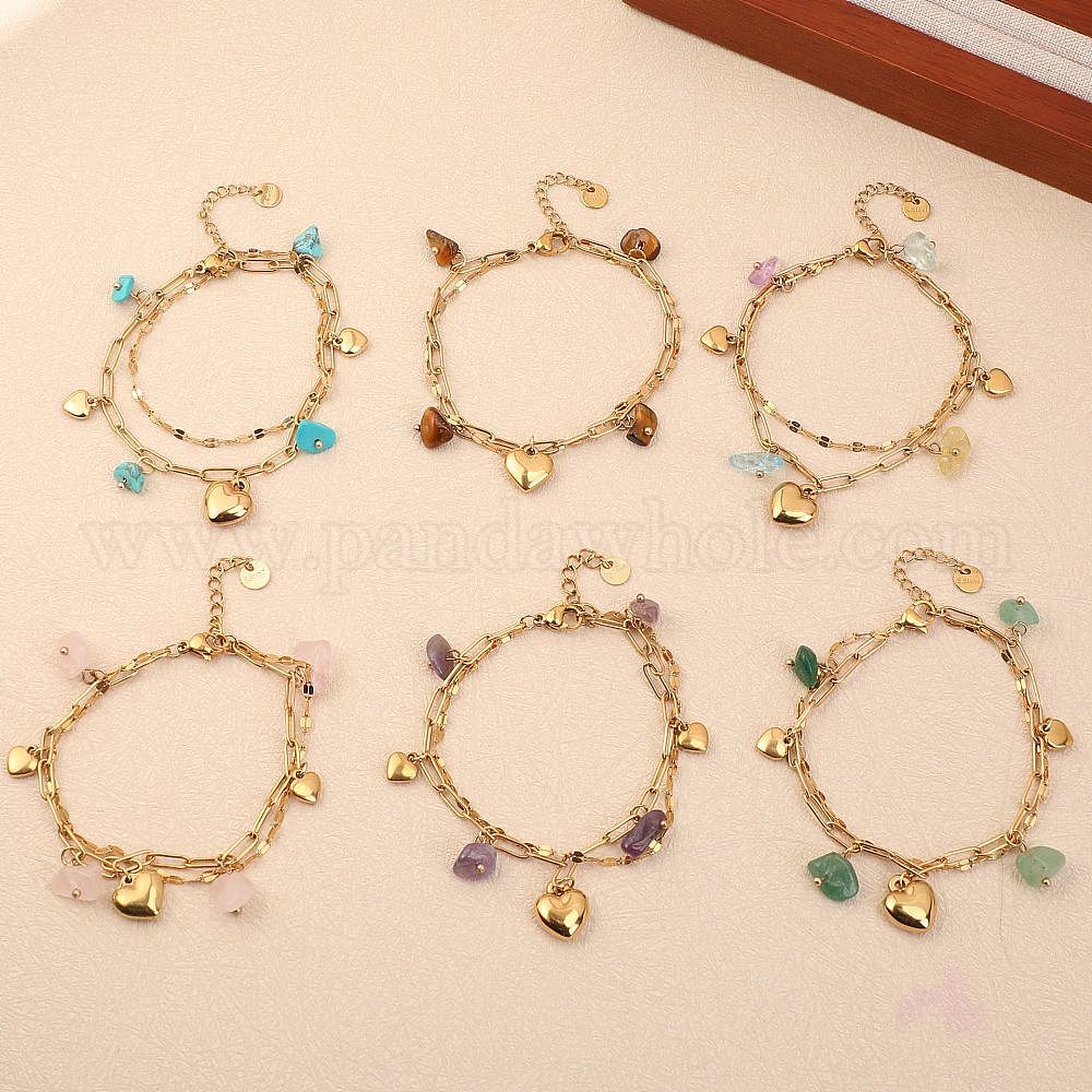 Браслеты с подвесками в виде сердца 304 из нержавеющей стали с драгоценными камнями, 304 Двухслойный браслет из нержавеющей стали в виде цепочки из скрепки и рифленой цепочки для женщин, золотые
