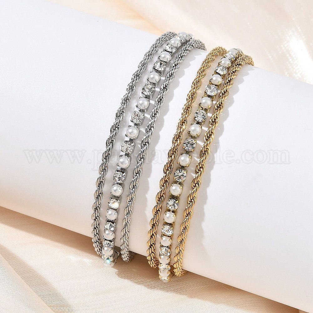 304 Двухслойный браслет из нержавеющей стали с цепочкой из страз для женщин, плоско-круглые, со стразами и пластиковыми бусинами, имитирующими жемчуг (03BQES)