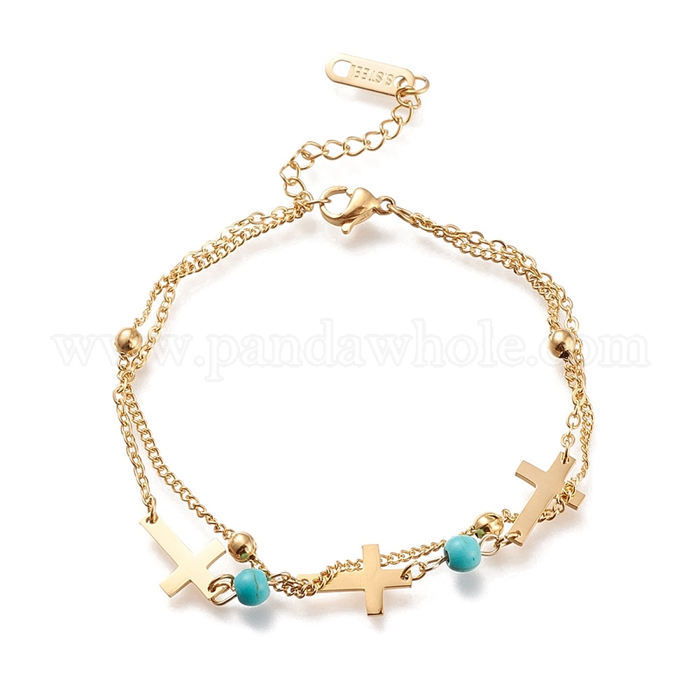 • Золотой 304 из нержавеющей стали браслеты многожильных, с синтетическими бирюзовых бусин и когтя омара застежками, крестик, золотые, 6-3/4 дюйм (17 см)