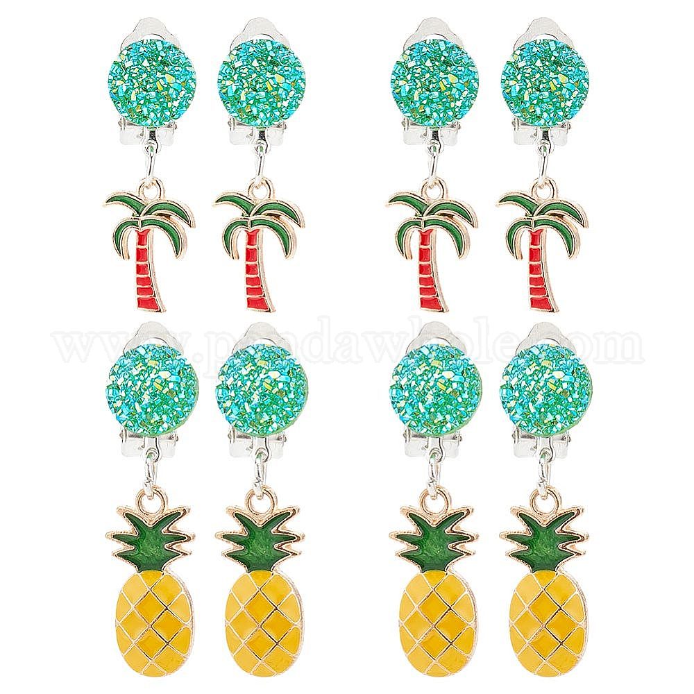 4 пары 2 серьги-клипсы с подвесками в виде кокосовой пальмы и ананаса, эмалированные, ювелирные изделия из платинового сплава без пирсинга для женщин