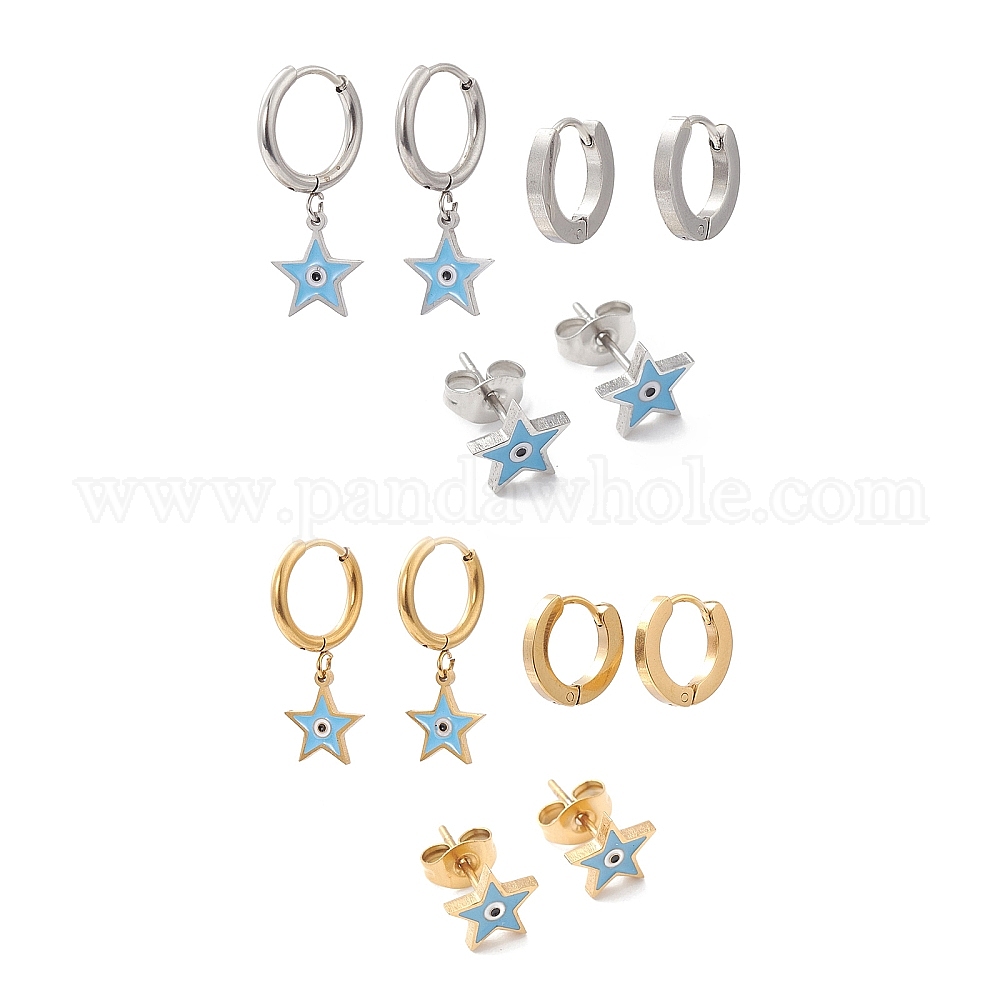 • Золотой 3 пары 3 серьги-кольца с эмалевой звездой и дурным глазом, ионное покрытие (ip) 304 серьги-гвоздики из нержавеющей стали для женщин, золотые, 7.5~27 мм, штифты : 1 мм, 1 пара / стиль
