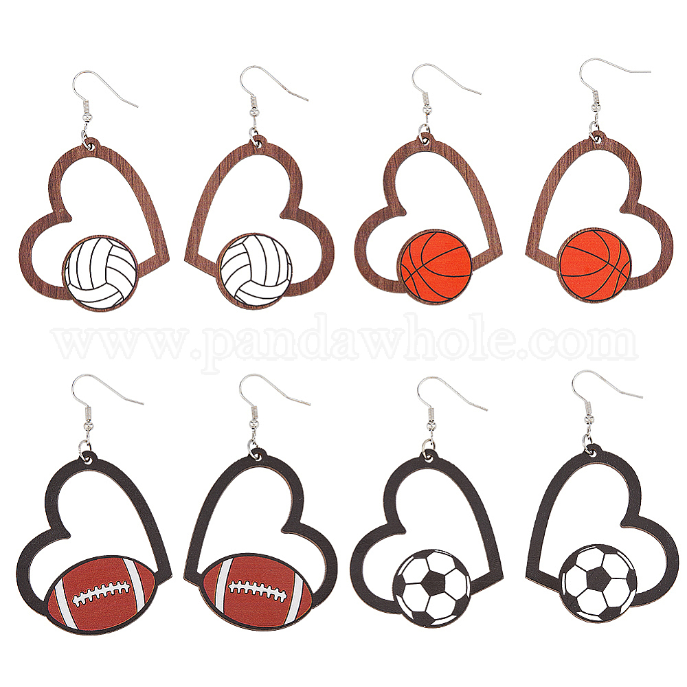 4 пары 4 стили спортивные тематические деревянные серьги-сердечки для женщин, 304 серьги нержавеющей стали, баскетбол, футбол и волейбол