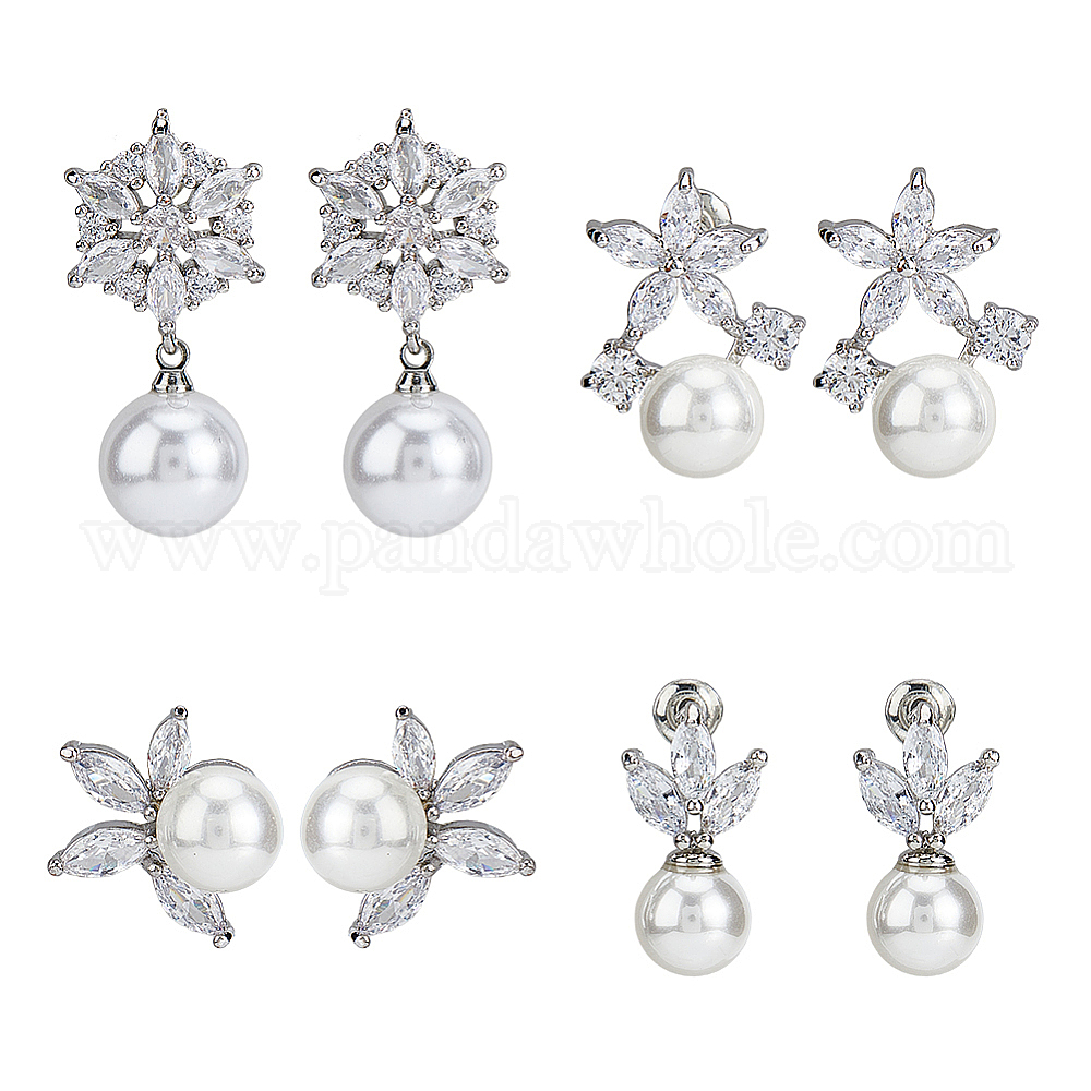 4 пары 4 стильные латунные серьги-гвоздики с микропаве из кубического циркония и пластиковыми искусственными жемчужинами, цветок
