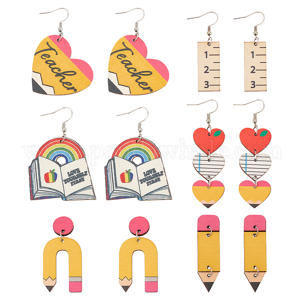 6 пары 6 стили деревянные серьги-подвески на День учителя с железными штифтами, серьги, сердце, карандаш, книга и линейка