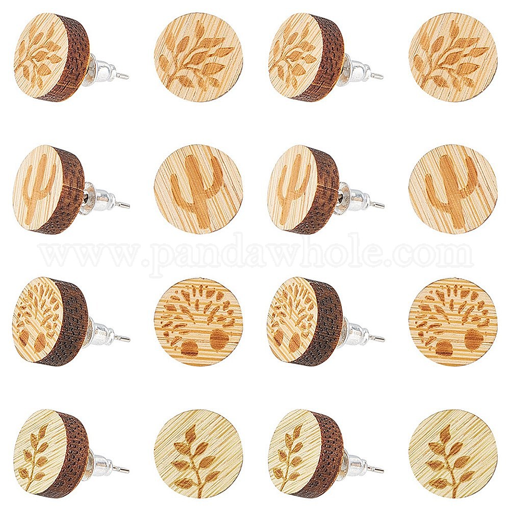 8 пары 4 стильные плоские круглые серьги-гвоздики из натурального дерева, с 304 штифтов из нержавеющей стали, дерево, лист и кактус