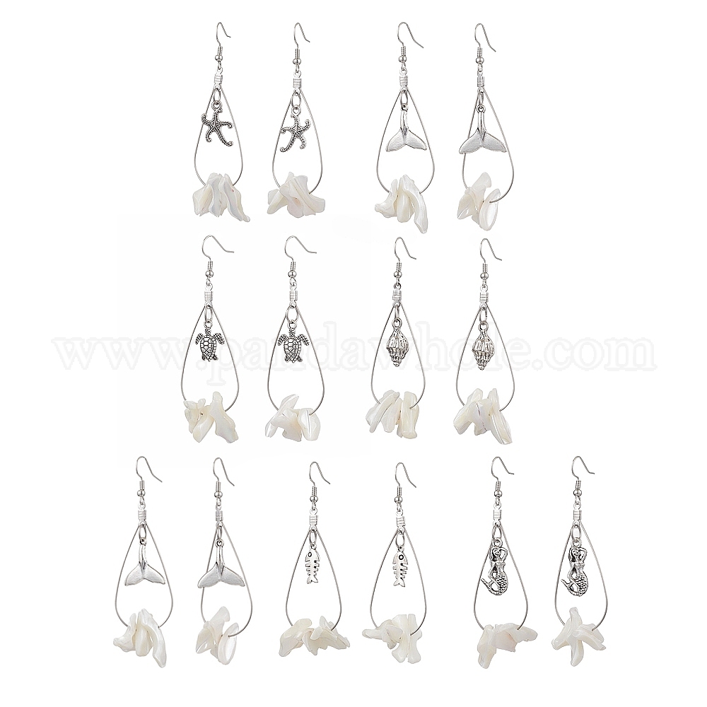 6 пары 6 стилей серьги с подвесками из натуральной трохидной ракушки, Сплав с подвесками, крючки для сережек из латуни и фурнитура 304 из нержавеющей стали, морская тема