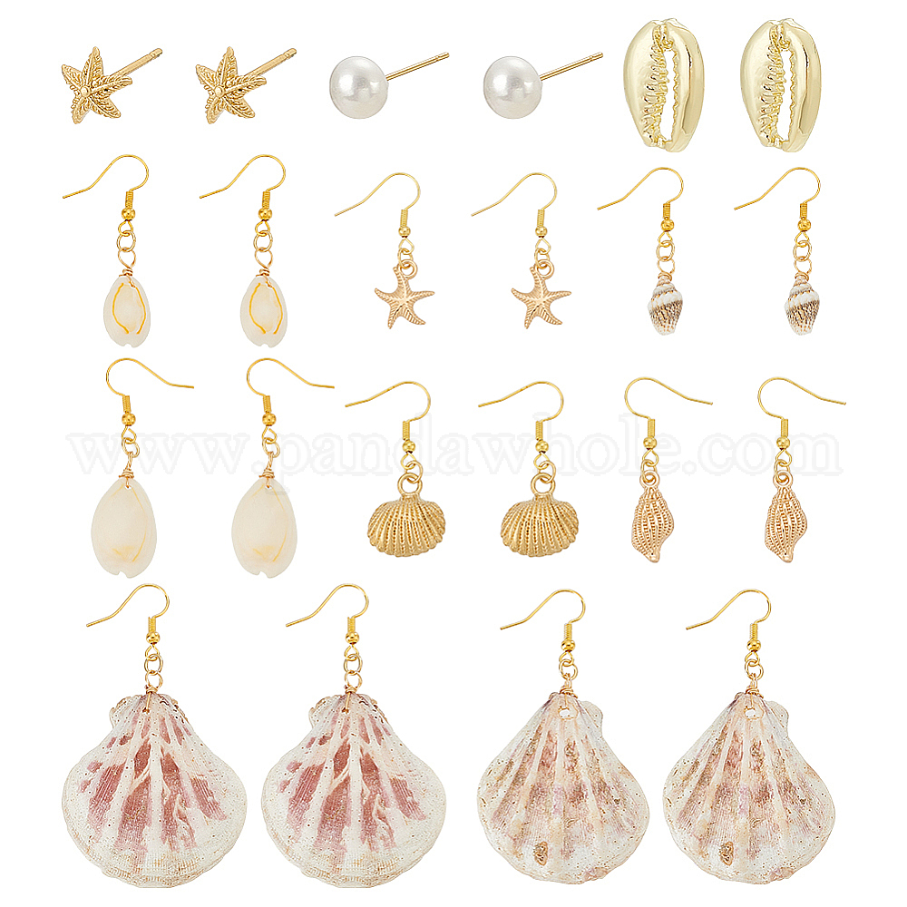 • Золотой 10пара из сплава и латуни, висячие серьги и серьги-гвоздики, с естественной оболочке, золотые, 37~70 мм, 10 пара / комплект