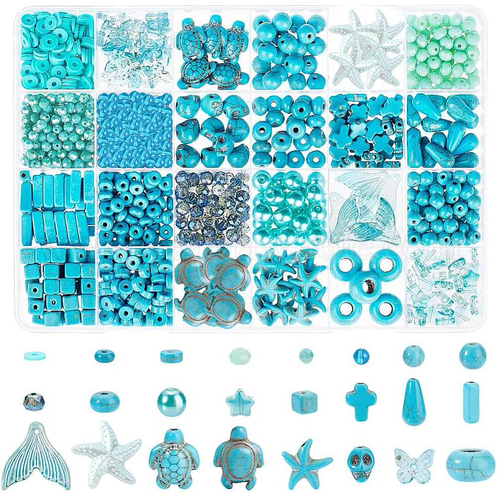 Набор для поиска поделок для изготовления ювелирных изделий, включая черепаховые, крестообразные, каплевидные и прямоугольные синтетические бирюзовые бусины, стеклянные круглые бусины хейши из полимерной глины, стеклянный кулон и фарфоровые кабошоны