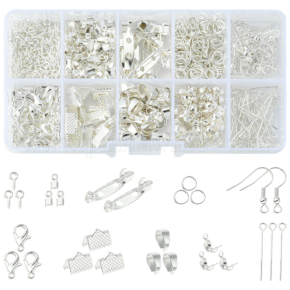 • Серебро Наборы для изготовления ювелирных изделий своими руками, включая застежки из сплава, Кончики железных бус, кольца для прыжков, крючки для сережек, булавки для глаз, зажимные скобы, обжимные концы лент и фурнитура для брошей, серебряные, 749 шт / коробка