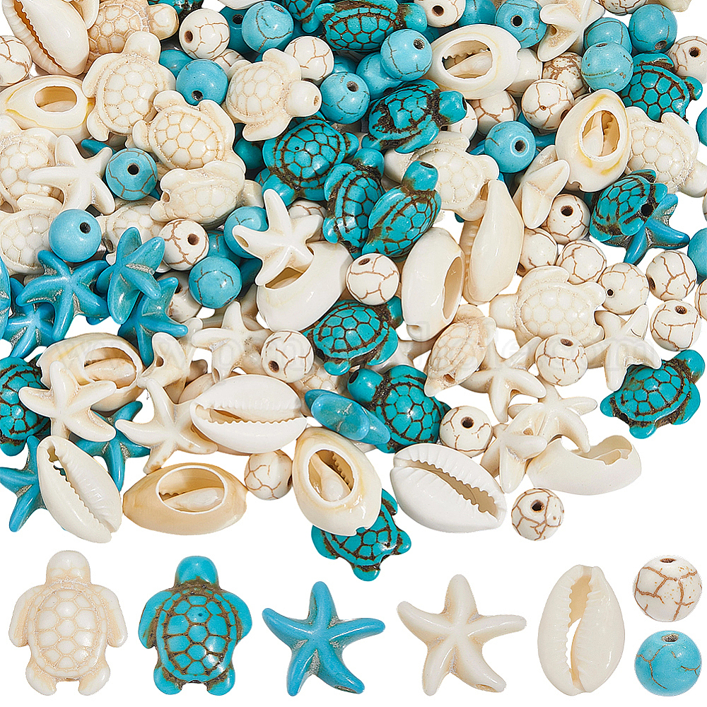 180шт. 6 стили набор бусин из окрашенного синтетического хаулита, магнезита и бирюзы, с 20шт. бусинами из натуральной ракушки каури, черепаха круглая форма панциря морской звезды