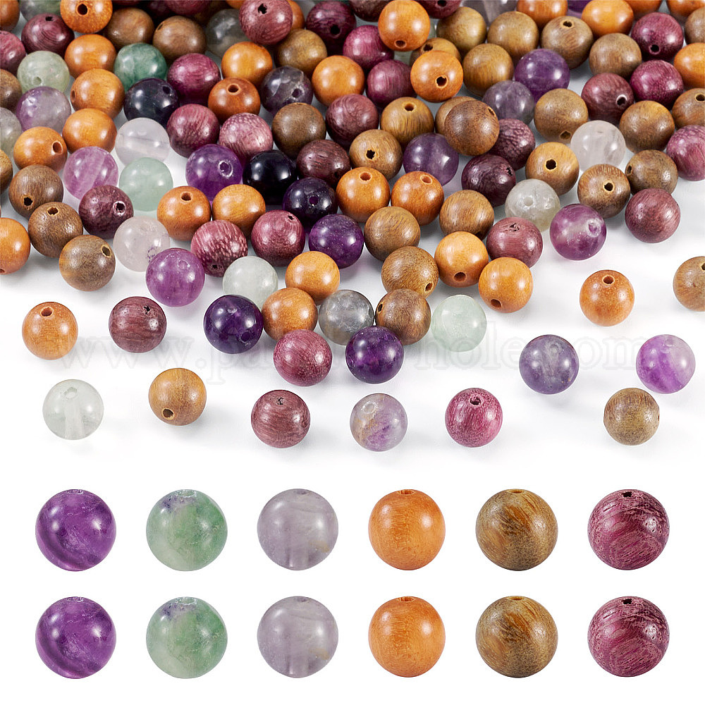 • Флюорит 195шт. 6 стили, наборы круглых натуральных фиолетовых флюоритовых и деревянных бусин, 8 мм, отверстие : 1 мм