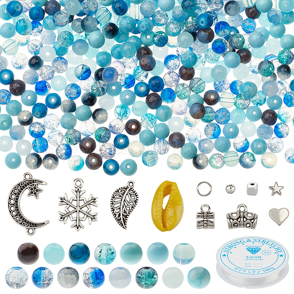 Наборы для самостоятельной маркировки ювелирных изделий, Эластичная кристальная нить, 450 шт. стеклянные круглые бусины, 60 шт. Подвески из сплава в тибетском стиле, 70 бусины из сплава шт., 10шт. раковины каури, 50шт кольца прыжок