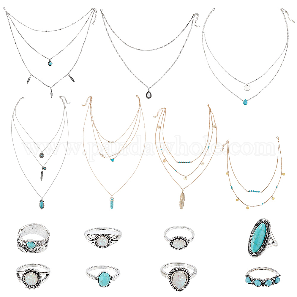 15шт. 15 овальные, каплевидные и перьевые подвески из синтетической бирюзы, многослойные ожерелья и кольца, набор ретро ювелирных изделий из сплава для женщин