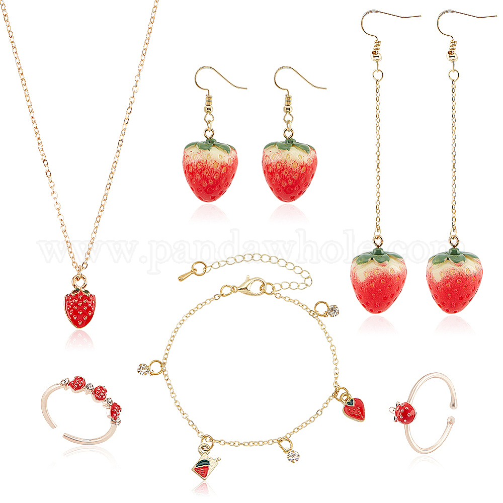 Ожерелье с подвеской из латунной эмали, серьги-подвески, открытое кольцо-манжета и браслет с подвесками в виде клубники, набор украшений из легкого золотого сплава для женщин