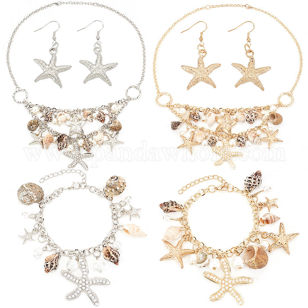 модные комплекты украшений в виде морских звезд и раковин: ожерелье длиной около 18.9 дюйма (48.2 см); нагрудник: 145x80мм;серьга длиной около 51мм, контактный: 0.6 мм; кулон: 28x27.5x6.5 мм, 2 цветов, 1 цвет / набор, 2наборы;