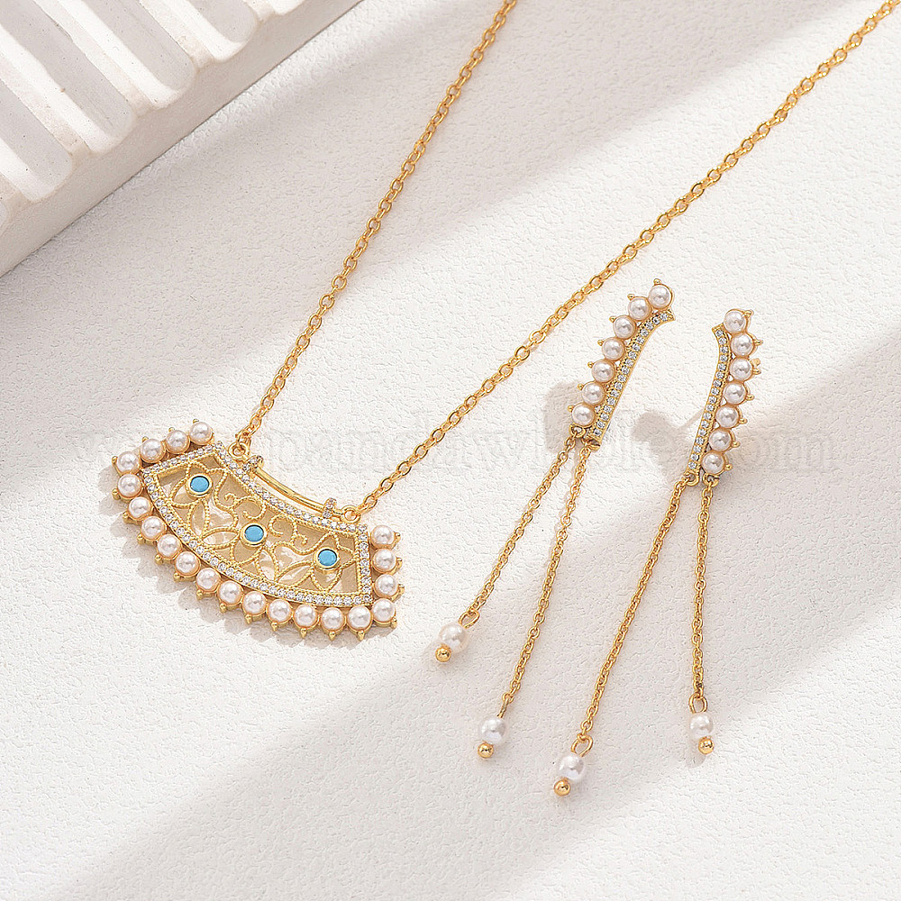 Элегантный винтажный латунный веер с подвеской из кубического циркония и серьги-гвоздики с подвесками комплекты ювелирных изделий, с пластиковой имитационной жемчужиной, для женщины подарок