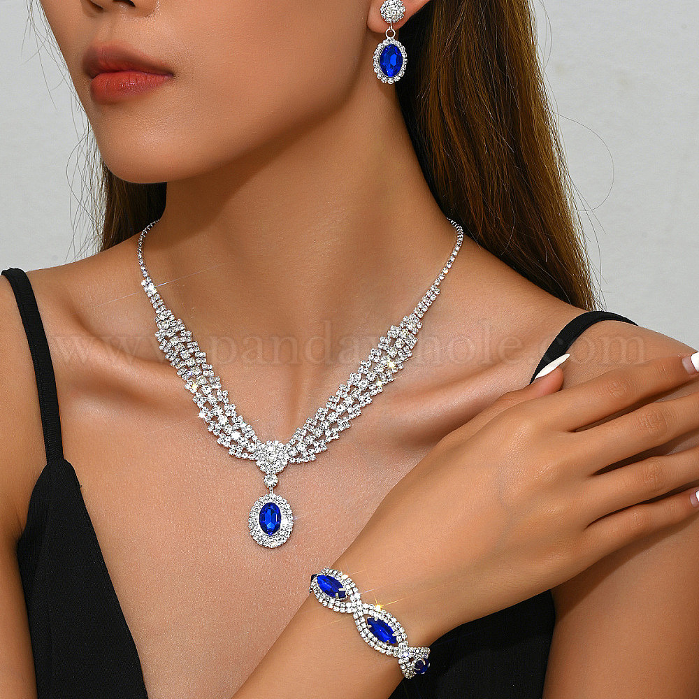 • Капри Синий Овальные и конские глаза латунные ожерелья, браслеты и комплекты серег со стразами, Капри синий, ожерелья: 13.39 дюйм(340мм); браслеты: 7.48 дюйм(190мм); серьги: 35x15мм