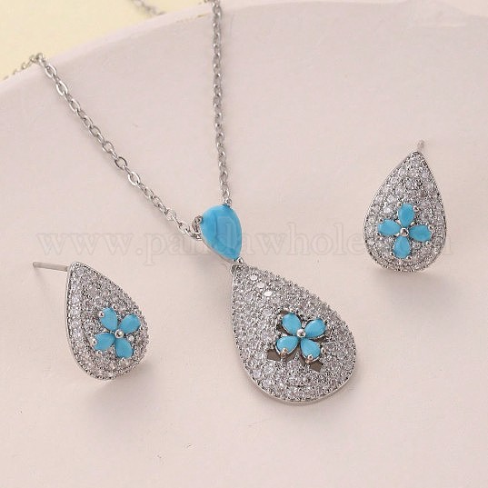 Комплекты из латунных подвесок и серег-гвоздиков с микропаве из кубического циркония, слеза