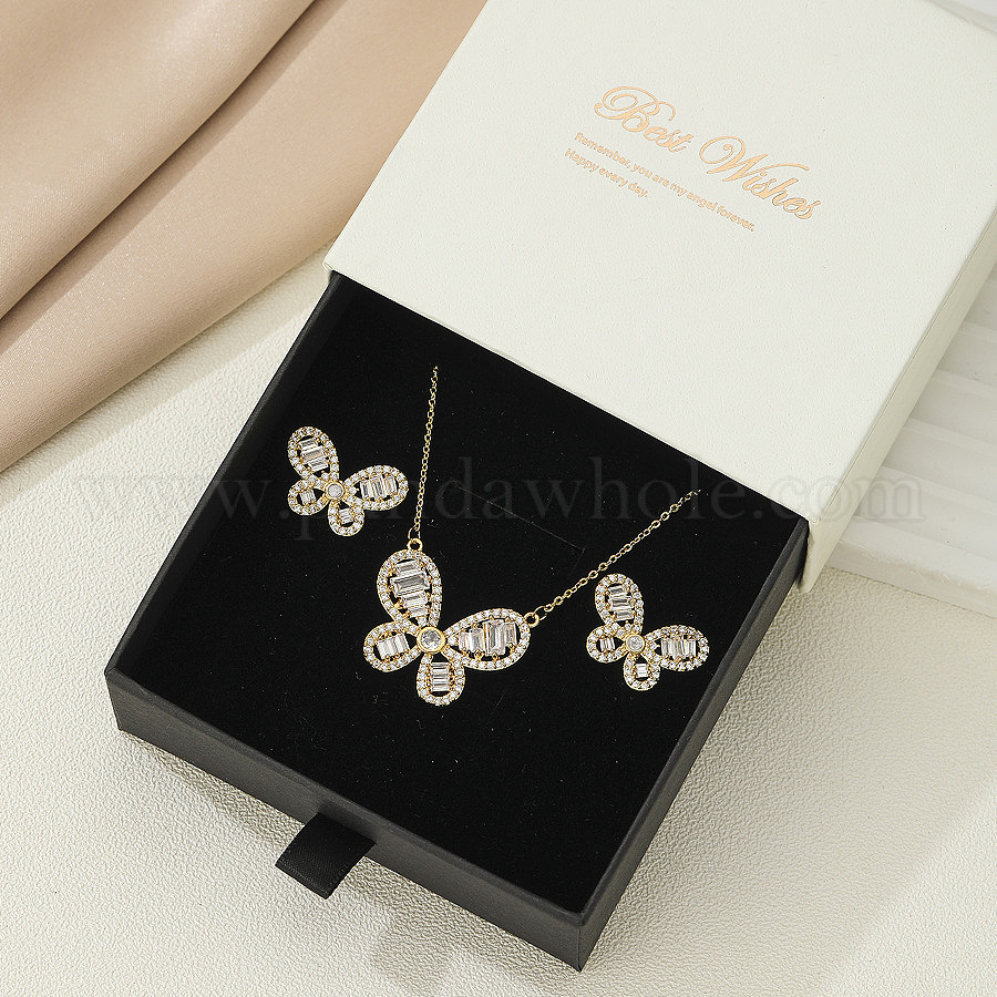 Наборы подвесок и сережек-гвоздиков из латуни с микропаве из прозрачных кубических цирконий., золотые, бабочка