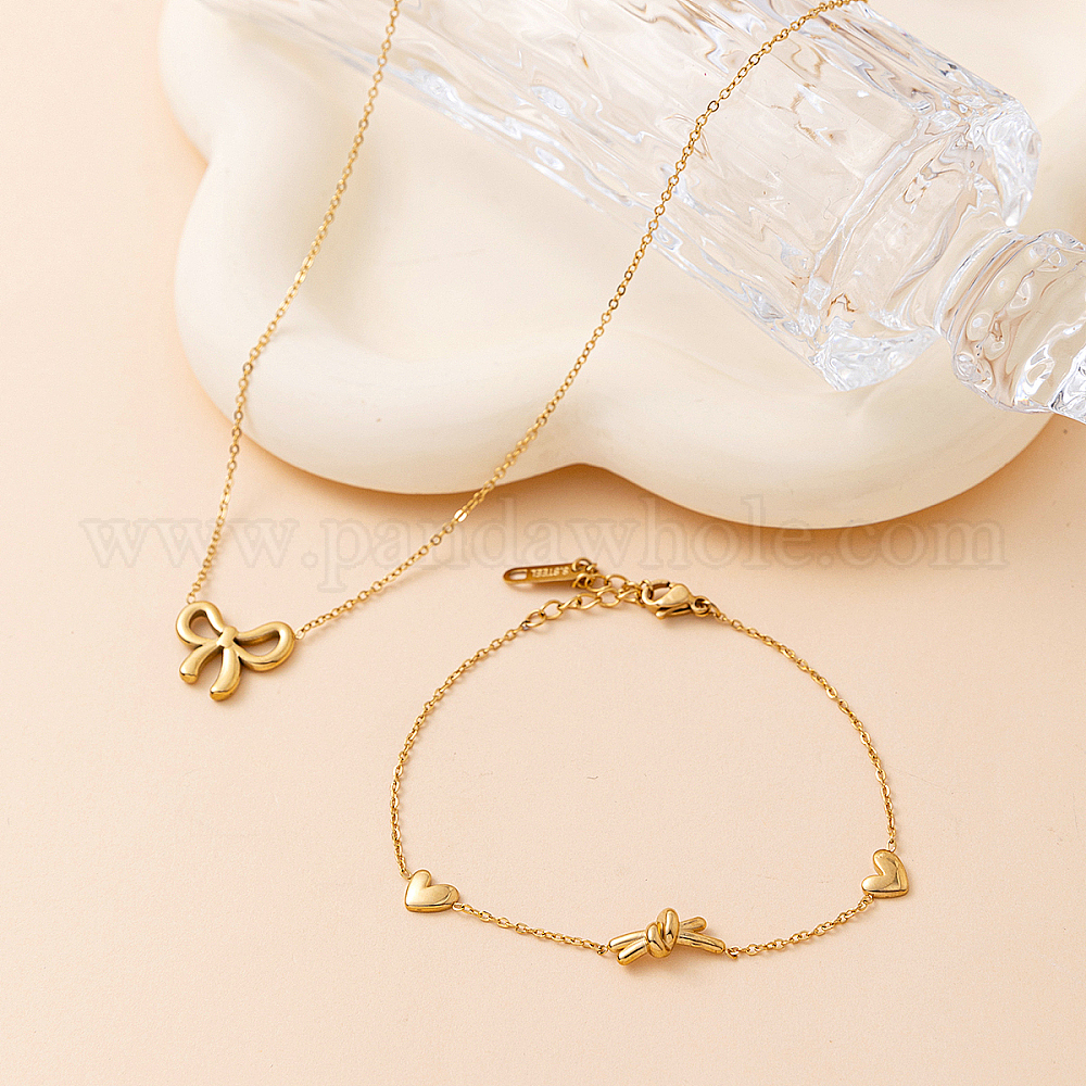 Сладкий 201 комплект из ожерелья с кулоном в виде банта из нержавеющей стали и браслета в форме сердца для модных дам