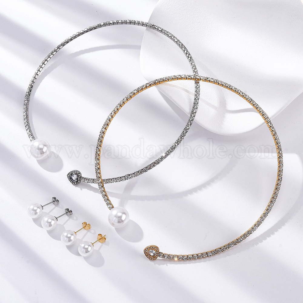 • Нержавеющая Сталь Цвет Круглые пластиковые серьги-гвоздики с имитацией жемчуга и комплекты колье-чокера в форме сердца с кубическими цирконами и стразами, 304 комплект украшений из нержавеющей стали для женщин, цвет нержавеющей стали, внутренний диаметр: 4.43 дюйм (112.5 мм)