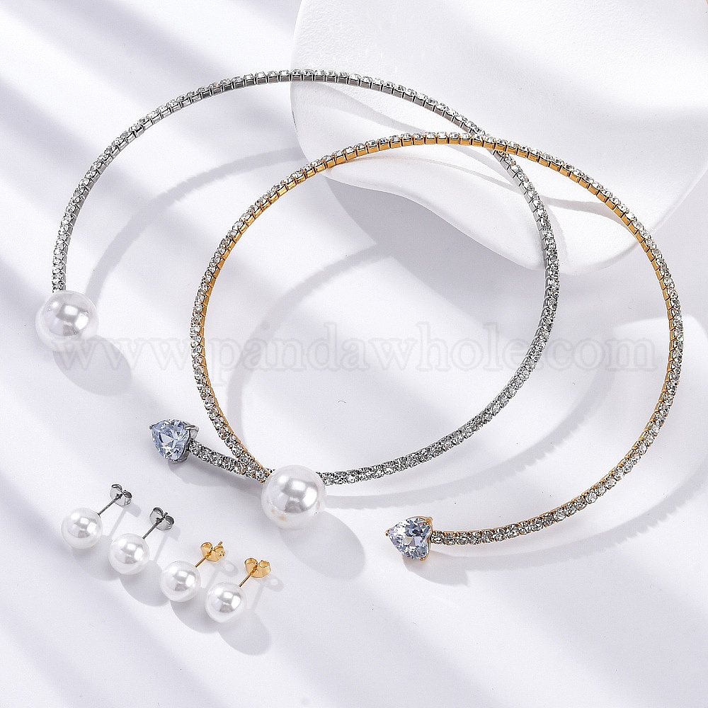 Круглые пластиковые серьги-гвоздики с имитацией жемчуга и колье-чокер с сердечками из кубического циркония и стразами, 304 комплект украшений из нержавеющей стали для женщин