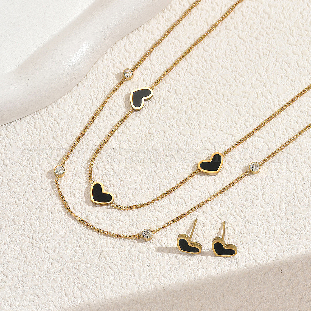 Комплект из двухслойного ожерелья и серег-гвоздиков в корейском стиле из нержавеющей стали в форме сердца, с четким кубического циркония (036658)