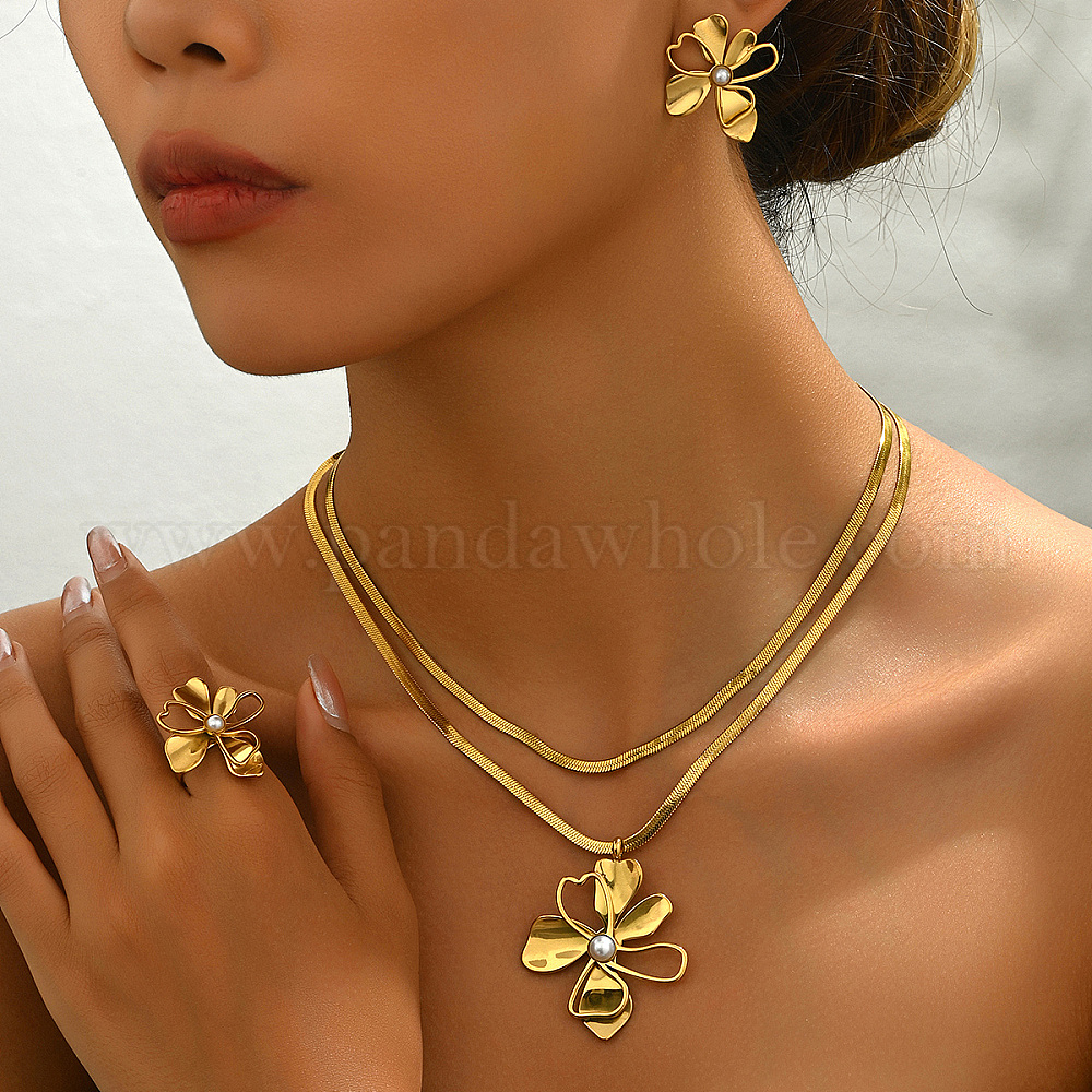 Комплекты из серег, ожерелий и колец с полыми цветами из нержавеющей стали для женщин