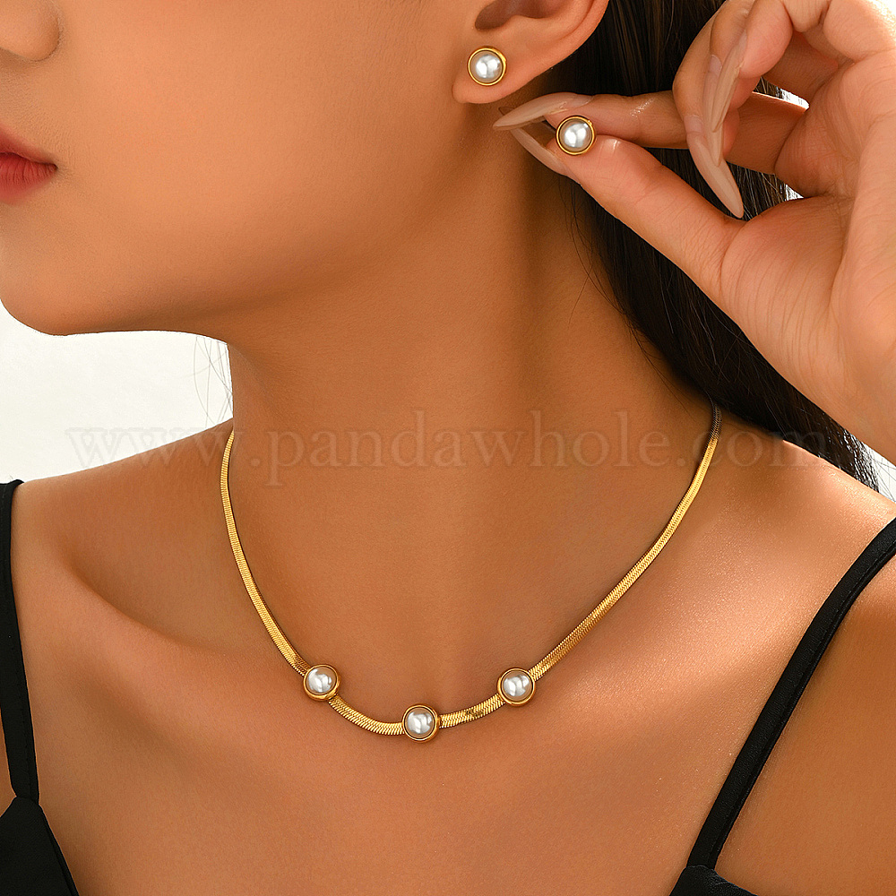 Комплекты из сережек-гвоздиков из нержавеющей стали и искусственного жемчуга, а также цепочек-змейек для женщин.