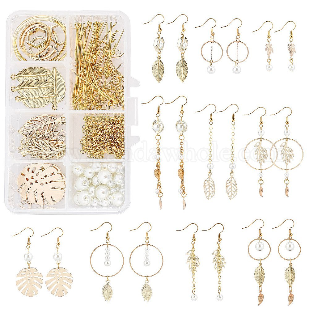 Наборы для самостоятельного изготовления сережек-подвесок из листьев и жемчуга, нитки стеклянных жемчужных бусин и оправы для бусин из сплава, латунные крючки для серег, прыгающие кольца, булавки и звенья (0284RE)