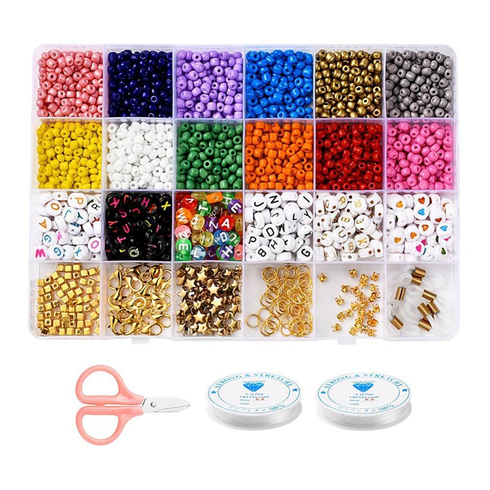 Набор для поиска ювелирных изделий из браслета своими руками, стеклянные бусины с геометрическим рисунком и акриловые буквы, эластичная эластичная нить, железная фурнитура, резиновые держатели для очков, застежки из цинкового сплава и ножницы из нержавеющей стали