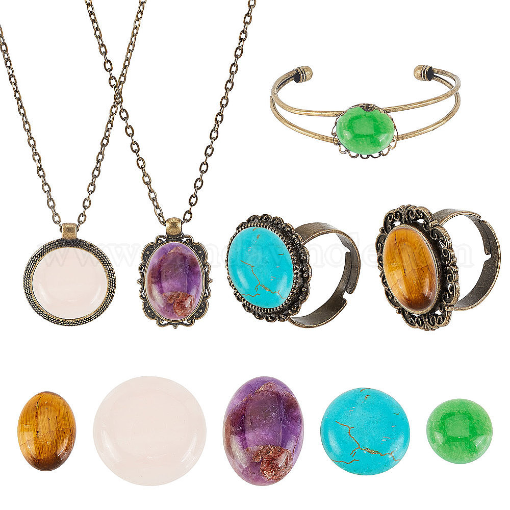 Набор для самостоятельного изготовления комплекта украшений из смешанных натуральных камней, включая настройку подвески из сплава, ожерелья из железной цепи и кольца на пальцах, латуни браслет, натуральные и синтетические смешанные каменные кабошоны