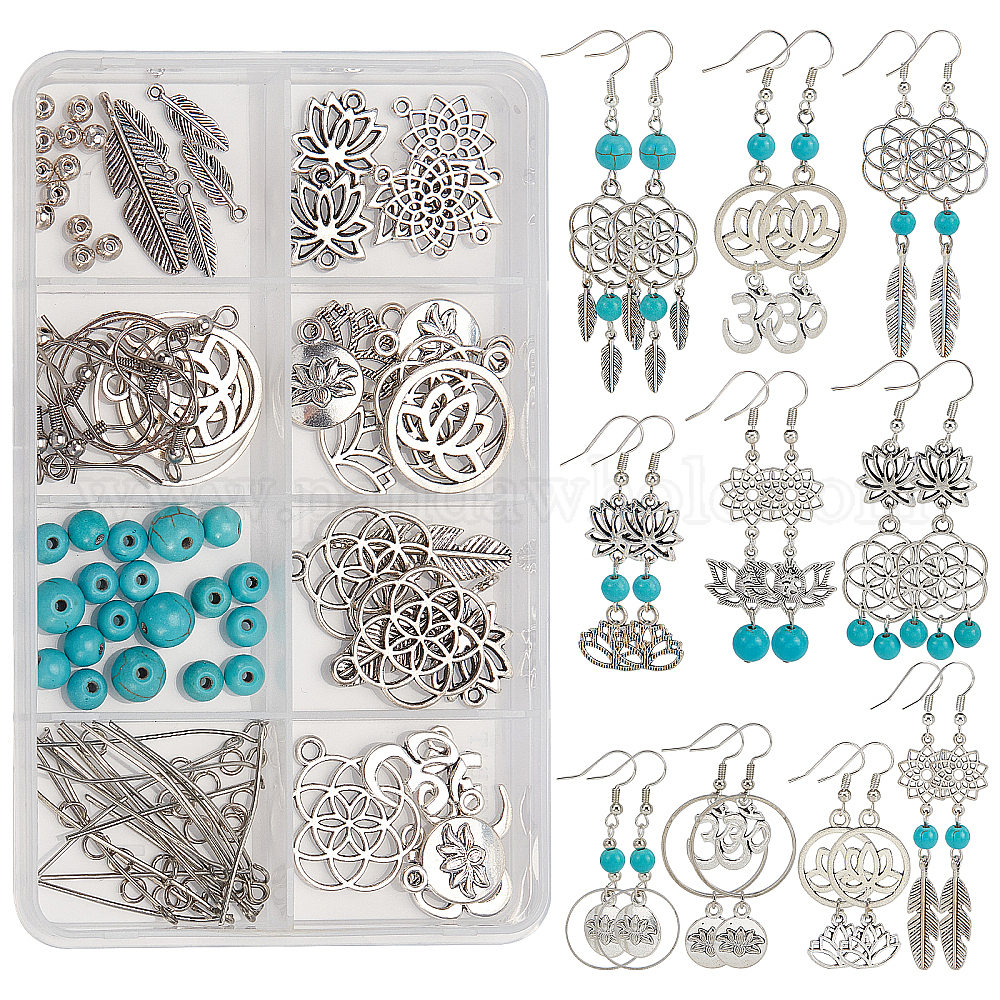 Наборы для самостоятельного изготовления сережек-подвесок в виде лотоса для йоги, включая подвески из сплава цветов, листьев и перьев и соединительные звенья, синтетические бирюзовые бусины, латунные соединительные кольца и крючки для серег