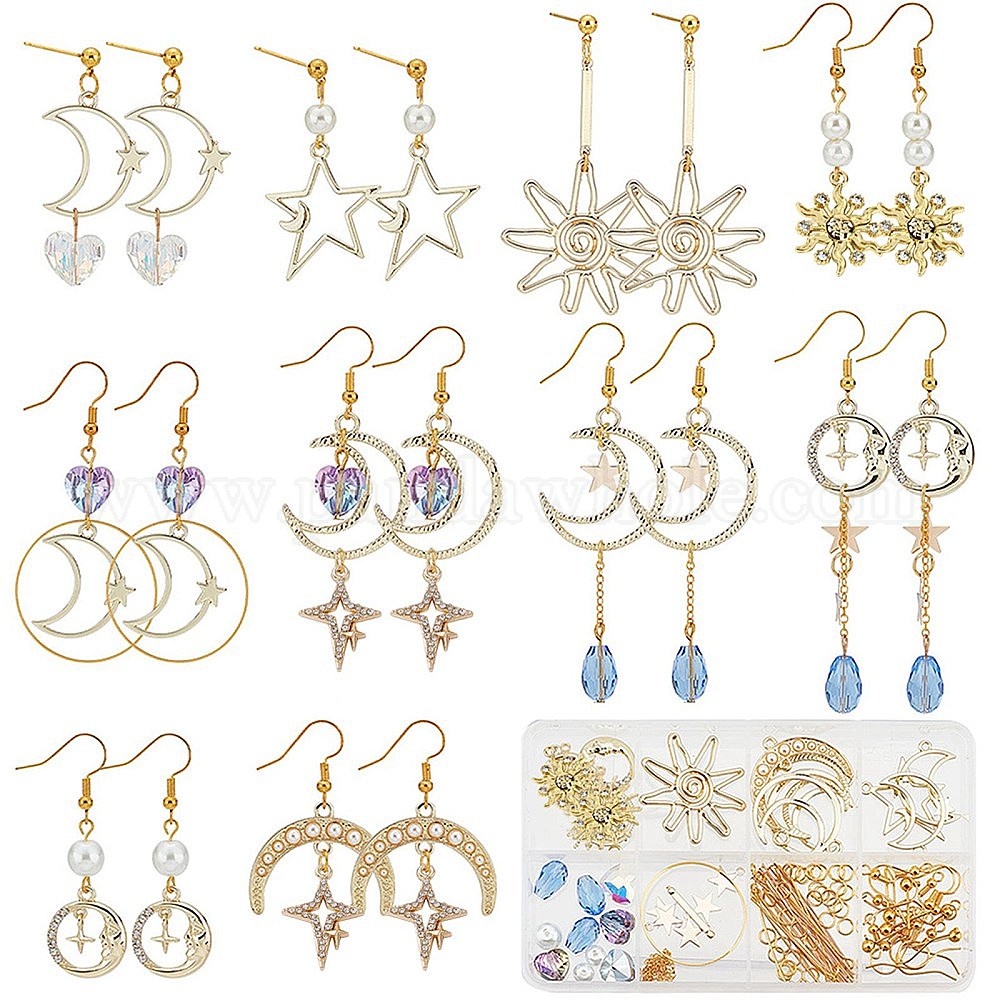 Наборы для самостоятельного изготовления сережек в виде звезд и солнца, включая подвески из сплава и латуни, Стеклянное сердце и жемчужные бусы, Латунные крючки для сережек