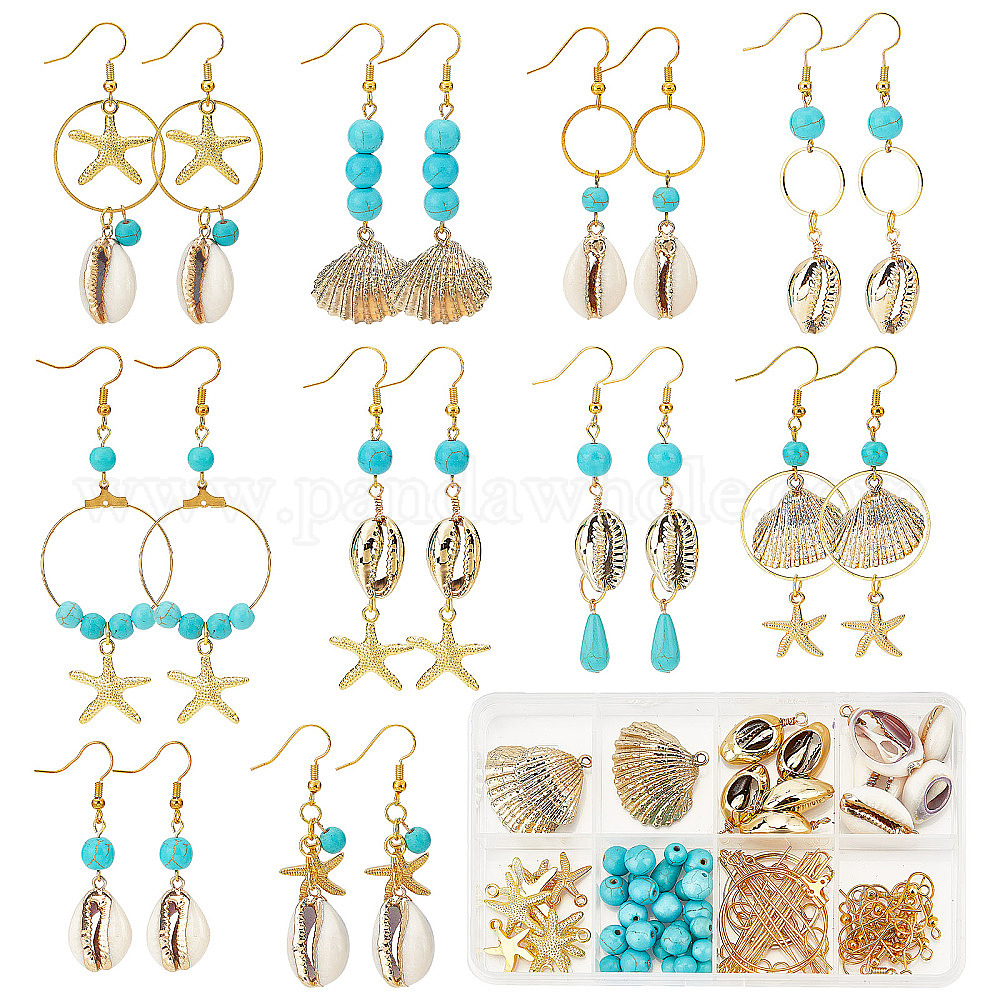 Набор для самостоятельного изготовления сережек из океанских драгоценных камней, включая натуральную оболочку и сплав и 304 подвески из нержавеющей стали, латунные кольца и крючки для сережек, синтетические бирюзовые бусины (02E5XZ)