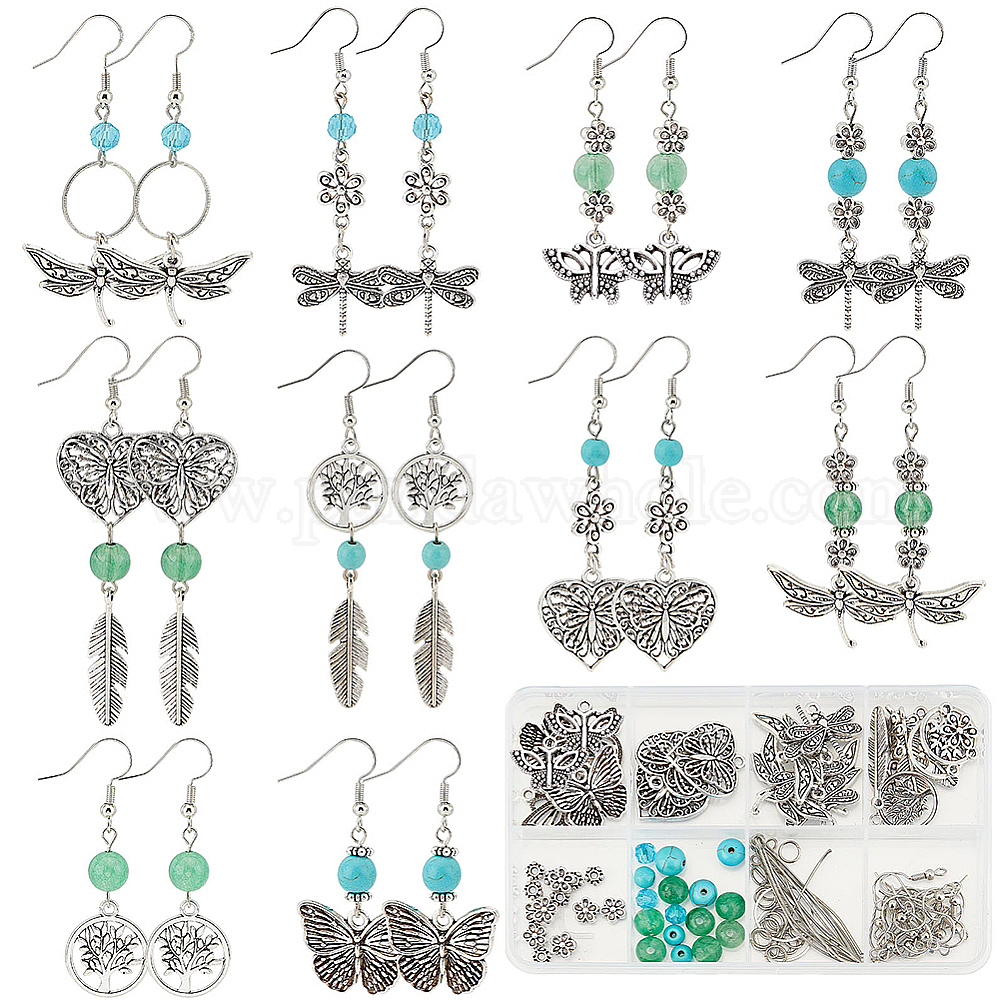 Наборы для самостоятельного изготовления сережек в виде бабочки-стрекозы, включая подвеску и бусы из сплава, синтетические бирюзовые и стеклянные и акриловые бусины, Латунные крючки для сережек
