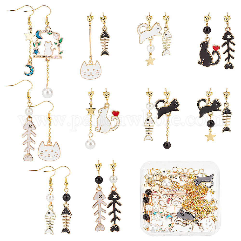 Набор для самостоятельного изготовления асимметричных сережек в виде кошки, включая соединители из сплава и эмалевые подвески, 304 прелести нержавеющей стали, Стеклянные жемчужные бусины, латунные крючки для серег и кабельные цепи