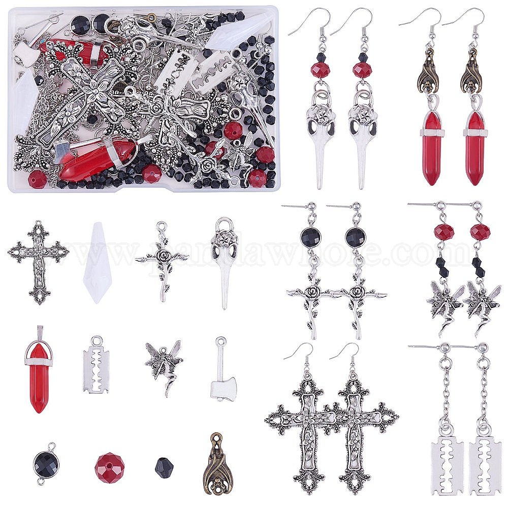 Набор для изготовления готических сережек своими руками, в том числе пуля и летучая мышь и крест и топор и лезвие стекло и сплав и латунные подвески и соединительные соединители, железные крючки для серег и серьги-гвоздики, стеклянные и акриловые бусины