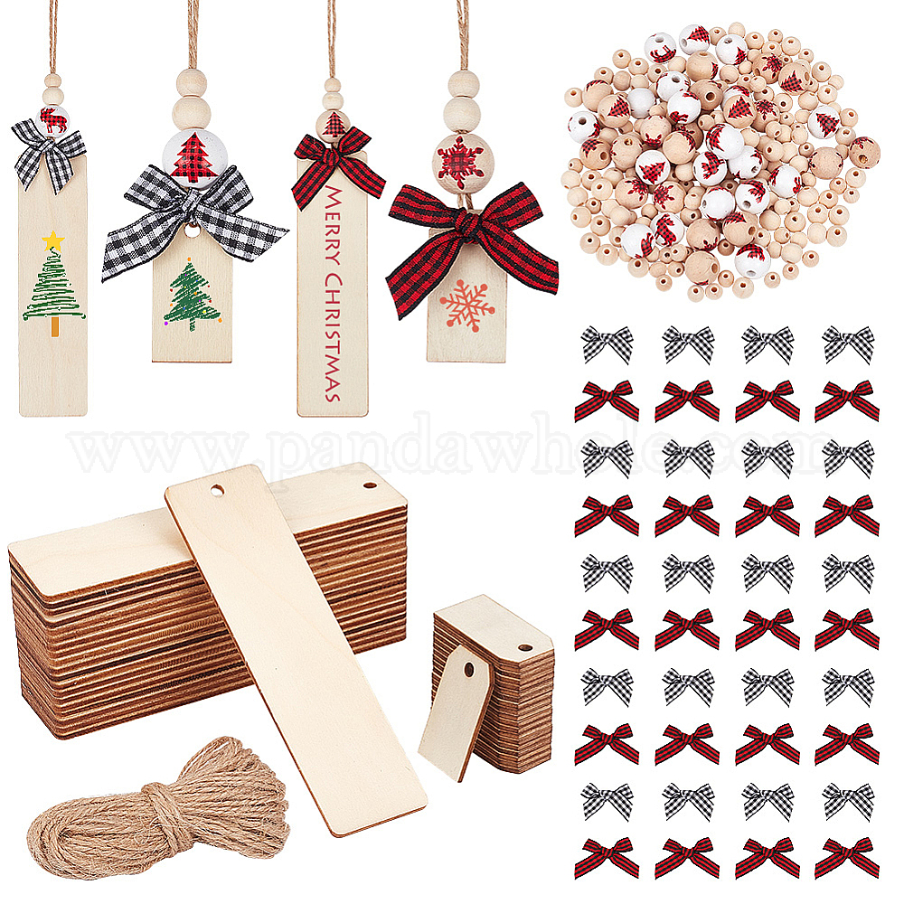 Набор для самостоятельного изготовления подвесного украшения на рождественскую тематику, включая круглые бусины из натурального дерева и прямоугольные подвески, бантом из полиэстеровой ленты с рисунком тартан