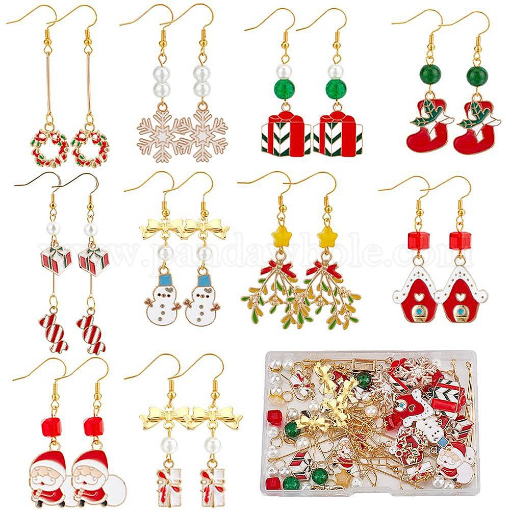 Набор для изготовления рождественских сережек, в том числе подвески из эмали из венка, дома, подарка и носка, стеклянная звезда и куб и бусины из искусственного жемчуга, Латунные крючки для сережек