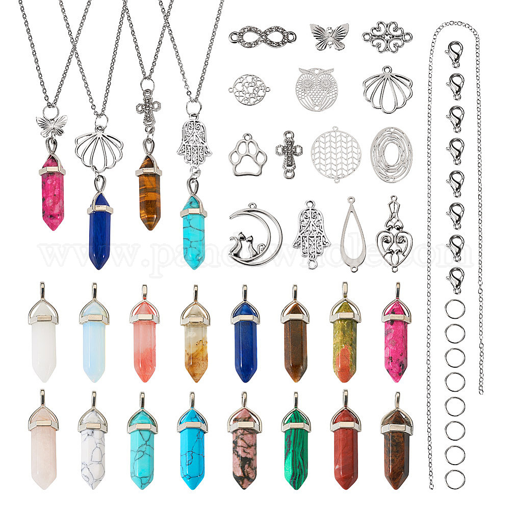 Набор для самостоятельного изготовления ожерелья-подвески из натуральных и синтетических драгоценных камней, включая подвески из сплава «собачья лапа», «сова» и «хамса», а также подвески из сплава «бабочка», разъемы из латунных звеньев и кабельные цепи