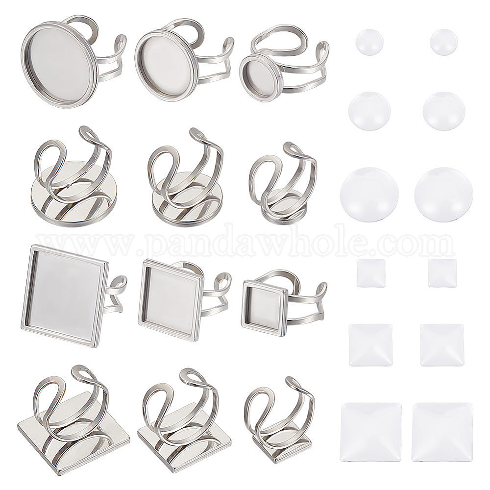 • Нержавеющая Сталь Цвет Набор для самостоятельного изготовления пустого купольного кольца, в том числе плоские, круглые и квадратные 201 кольца манжеты из нержавеющей стали, Кабошоны из стекла, цвет нержавеющей стали, 24 шт / коробка