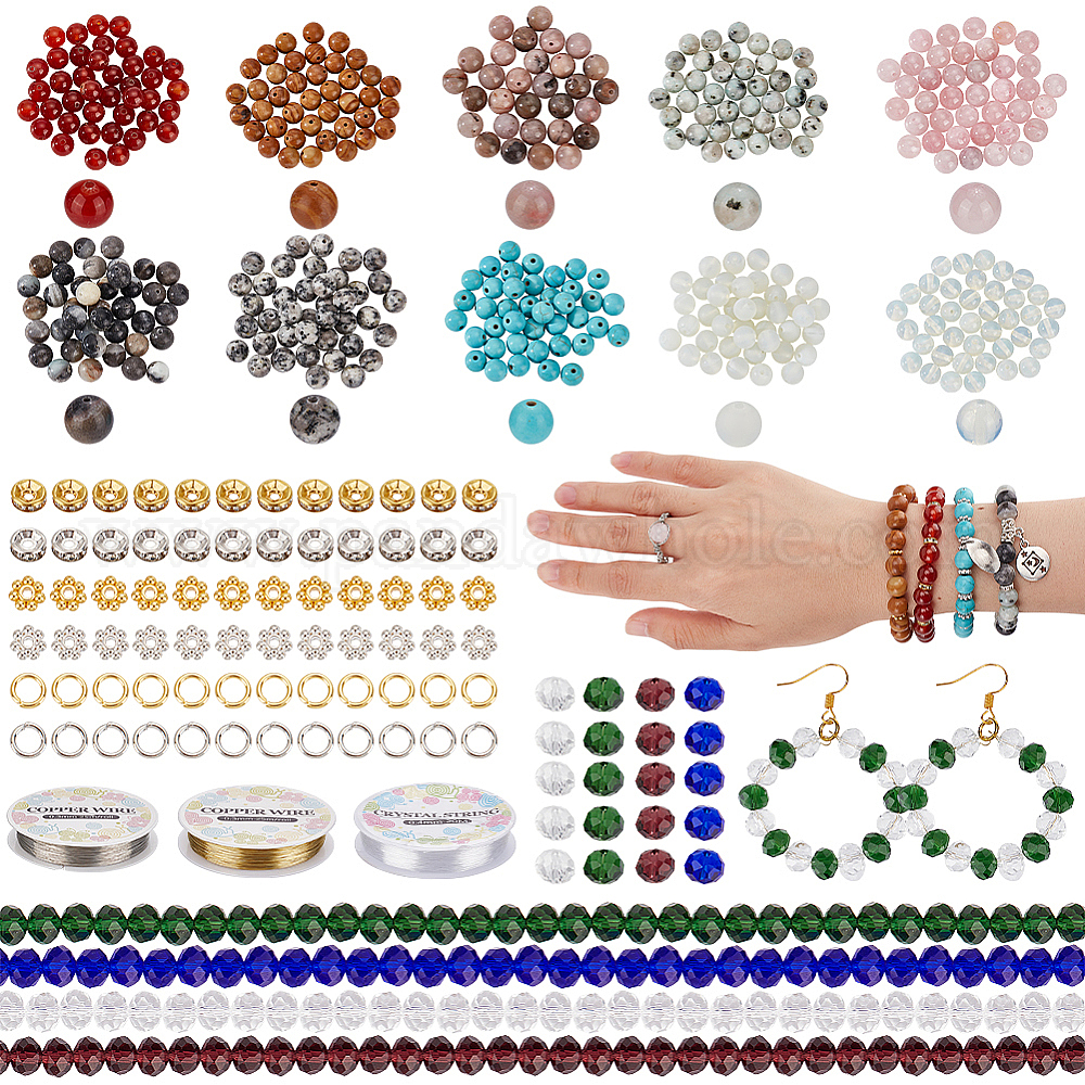 Набор для самостоятельного изготовления браслета и кольца, включая натуральные и синтетические смешанные драгоценные камни, круглые и стеклянные биконусы и сплавы, цветы и стразы, космические бусины, медная проволока, эластичная нить