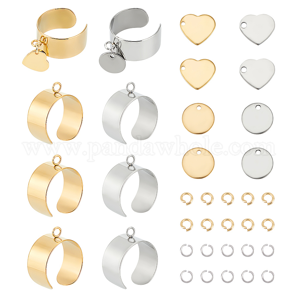 • Золотой & Цвет Нержавеющей Стали Набор для самостоятельного изготовления кольца-манжеты, включая 304 основание с петлей из нержавеющей стали и подвески, плоские круглые и сердце, золотые и нержавеющая сталь цвет, 36 шт / коробка
