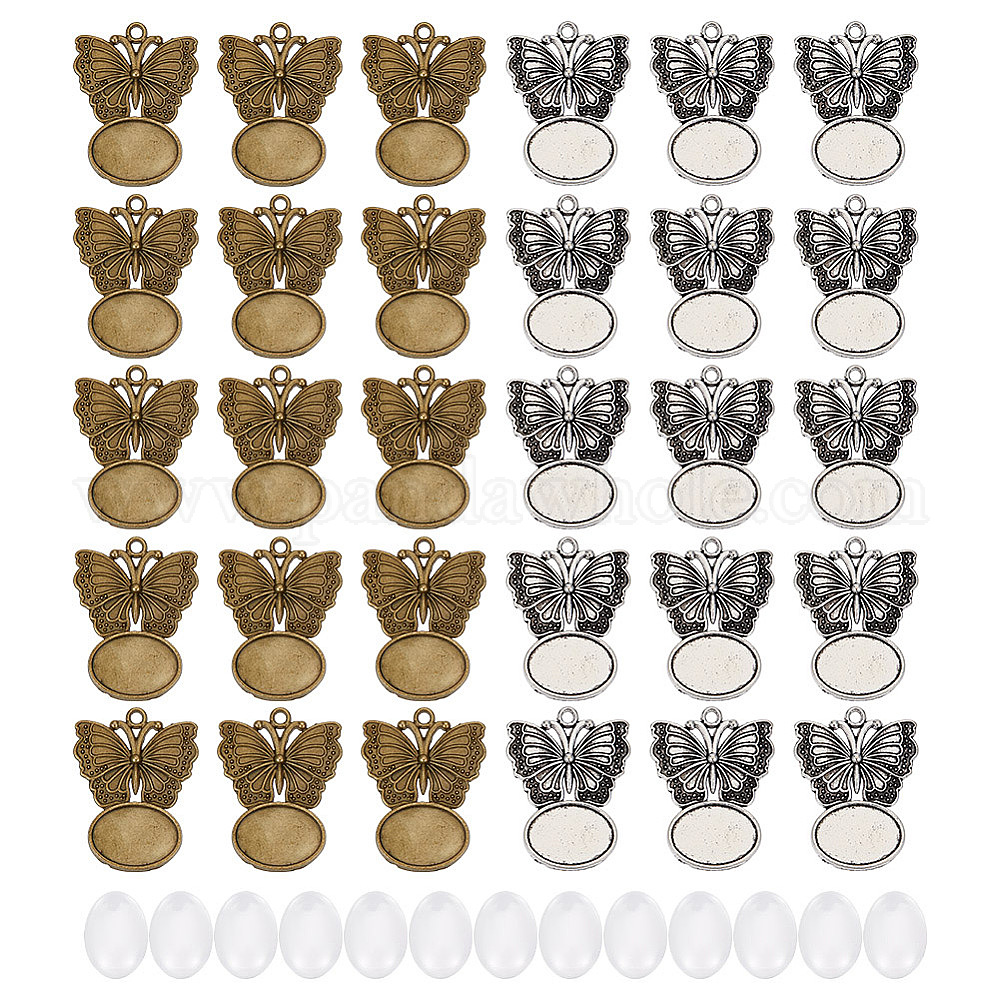 • Антично-бронзовый и Антично-серебристый Набор для изготовления подвески своими руками, включая подвеску из сплава в тибетском стиле в виде бабочки в форме кабошона, овальные стеклянные кабошоны, античная бронза и старинное серебро, 120 шт / коробка