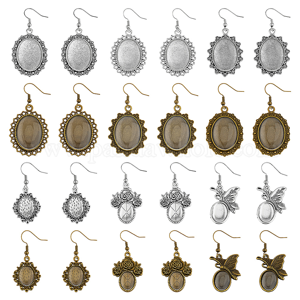 Наборы для изготовления сережек diy, в том числе латунные крючки для сережек, Сеттинги для кабошонов или кулона, сплав, тибетский стиль , прозрачные стеклянные овальные кабошоны