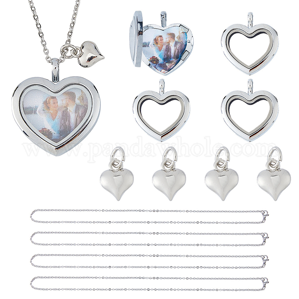 • Нержавеющая Сталь Цвет Комплекты ожерелья diy, в том числе 304 ожерелье из нержавеющей стали, подвеска-медальон из сплава магнитного стекла с фотографией живой памяти и латунные подвески в форме сердца, цвет нержавеющей стали, 17.72 дюйм (450 мм), 4 шт