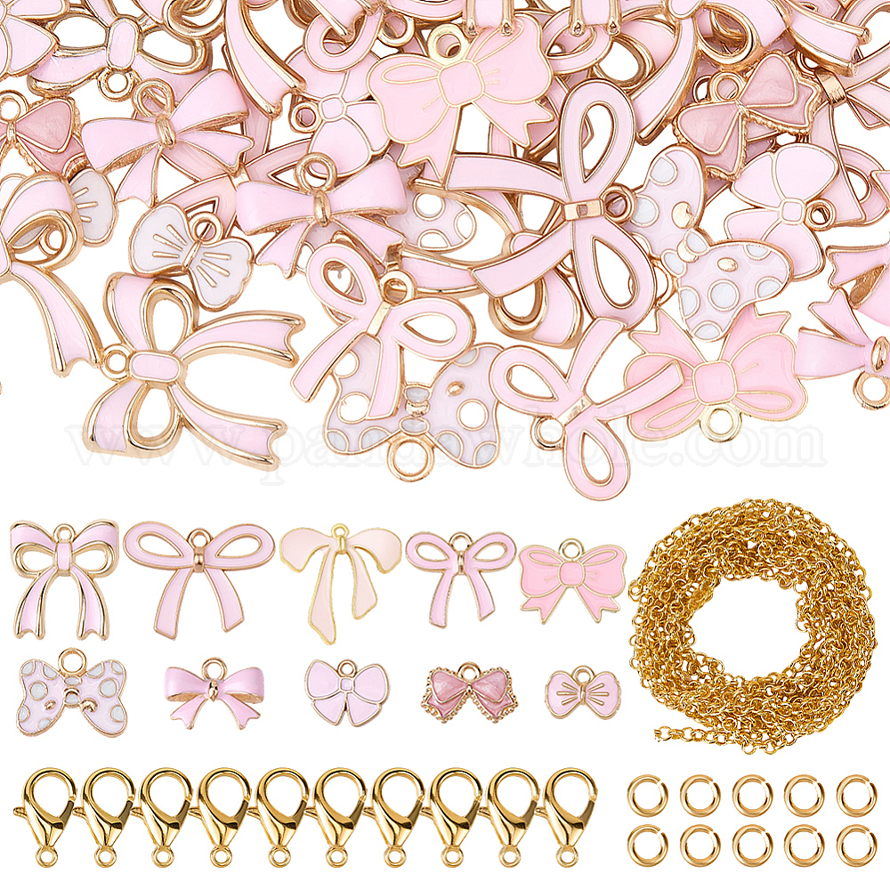 • Pink Наборы для изготовления ожерелий своими руками, включая подвески из сплава с узором в виде бантика и эмалью., Железные соединительные колечки, железные цепи с латунным покрытием, Карабин-лобстер из цинкового сплава, розовые, 11~26.5x12~26x1~4 мм, отверстие : 1.4~3 мм