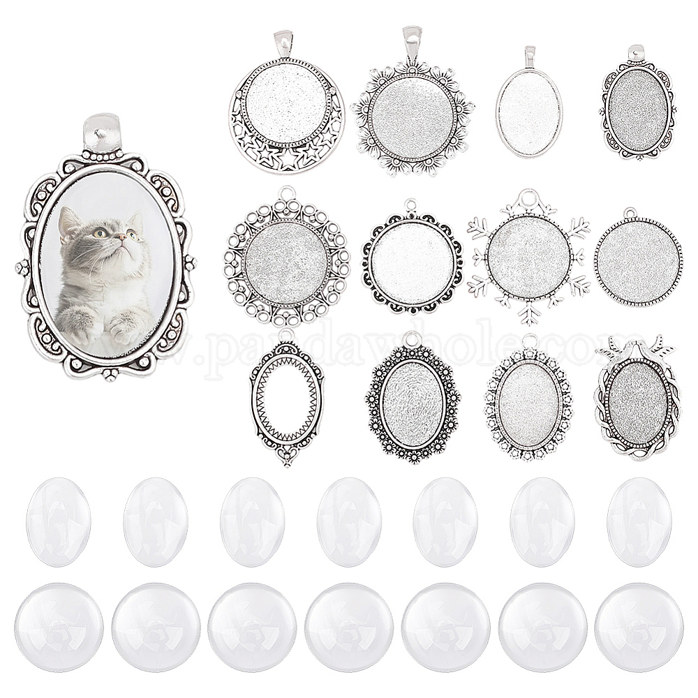 Наборы для изготовления кулонов своими руками, включая оправы для подвесок из сплава в виде кабошонов и стеклянные кабошоны.